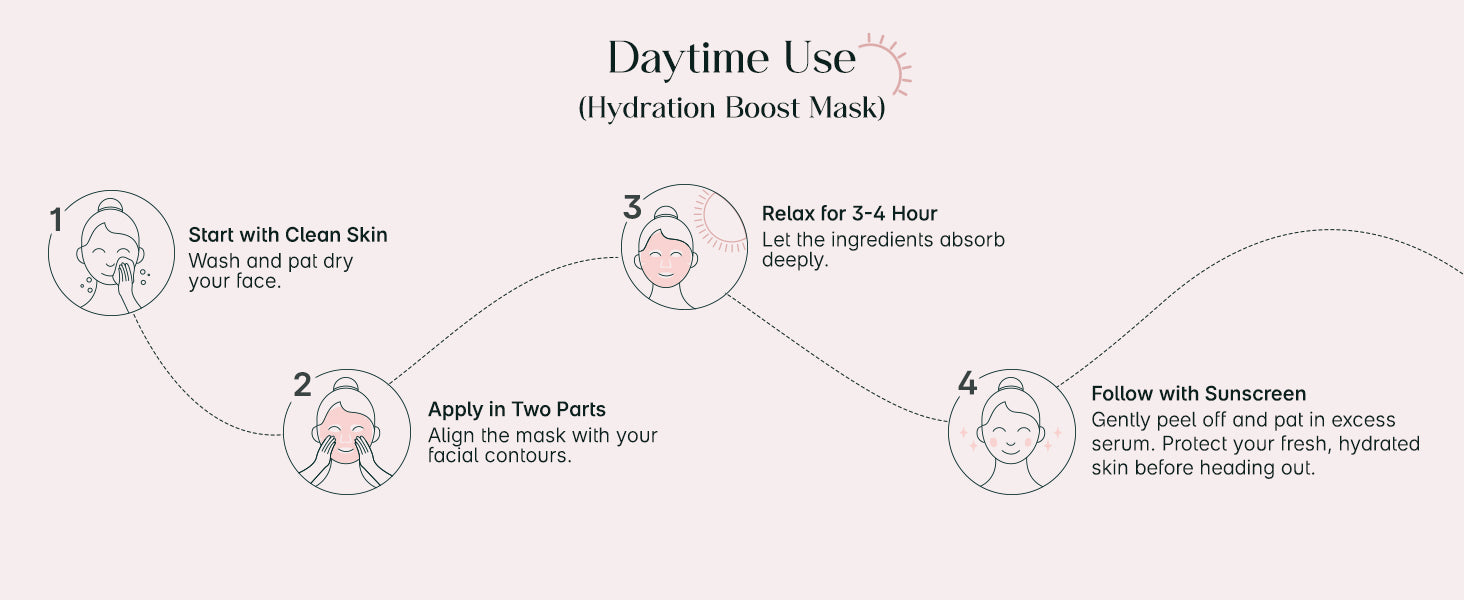 For daytime use, apply the mask for 3-4 hours or until it turns transparent to give your skin a hydrating boost.